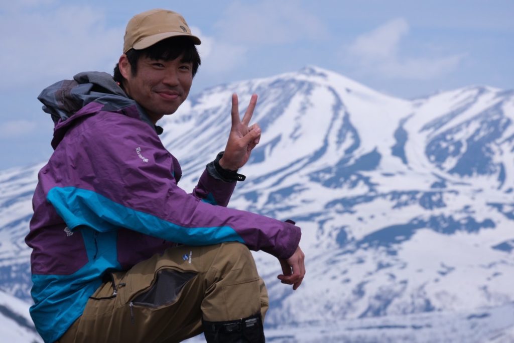 残雪のトムラウシ山を背景に